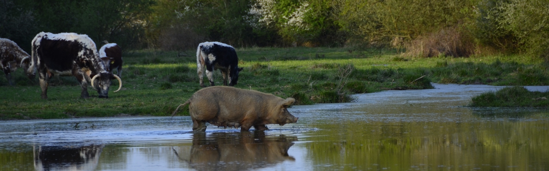 Our Wild Range Tamworth pigs love rootling our wetlands and wood pastures and gorging on acorns from ancient oaks. This rare native breed forages year round, helping to restore habitat for rare species like the turtle dove.