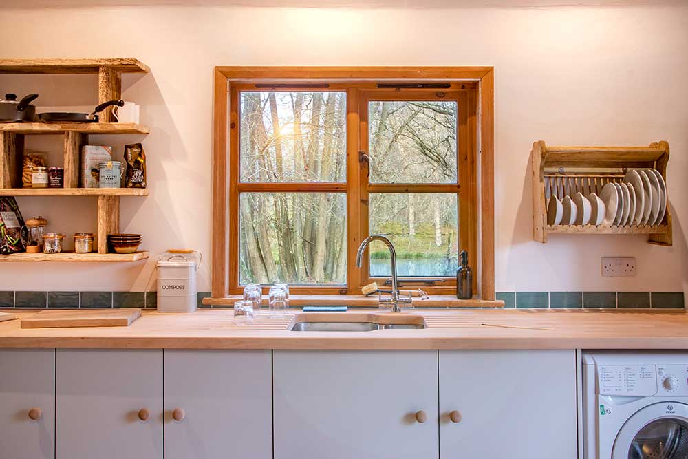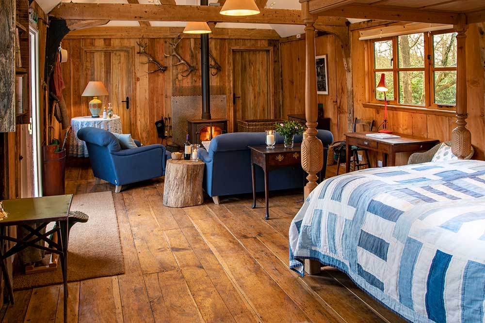 The Bothy in the Woods, located near the tranquil Springwood Pond, has been transformed into a charming rustic bridal suite for the Friday and Saturday nights. The spacious main room features a cozy four-poster bed at one end, with a comfortable sofa and armchair around a wood-burning stove at the other. The en suite bathroom has a gigantic, luxurious bath with a separate shower, and there’s a charming, fully-equipped kitchen.